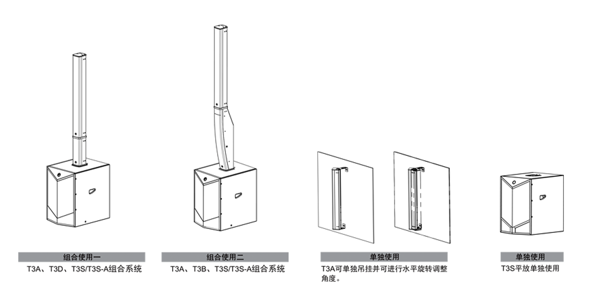 · T3A除了可以与其他音箱模块组合使用外,也可单独吊挂使用