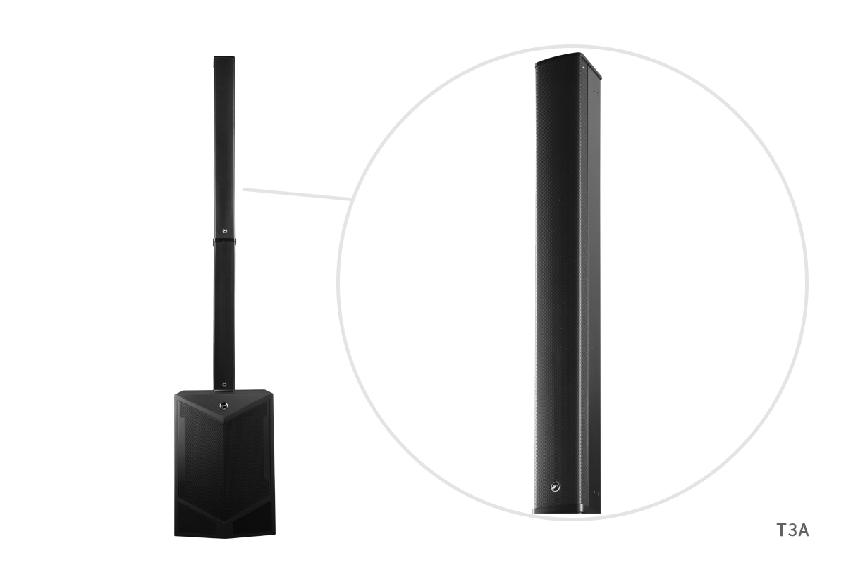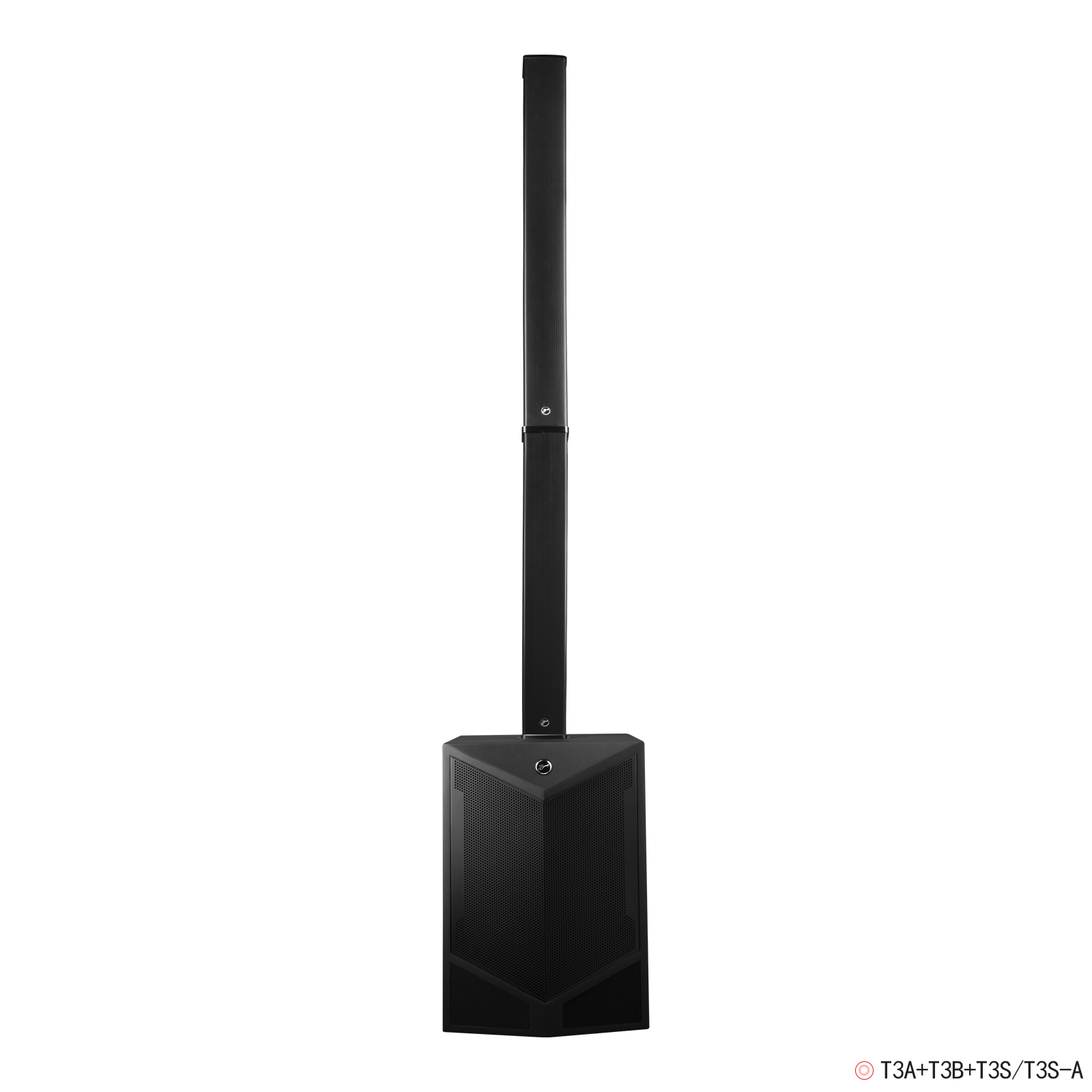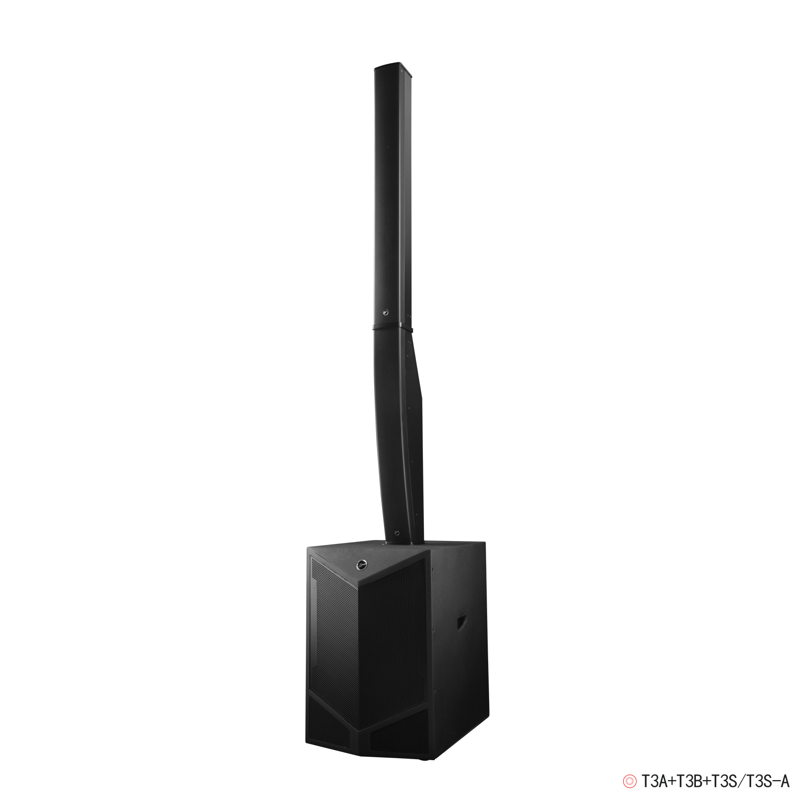 上部直线形阵列T3A全频箱主要负责中远场的音场覆盖,中部弧形阵列T3B全频箱,主要负责近场的音场覆盖,采用直插即用的快捷连接装置,可方便快捷的配合T3S超低频音箱,组合成一套强大的近、中、远场分区的专业线阵源扩声音箱系统。