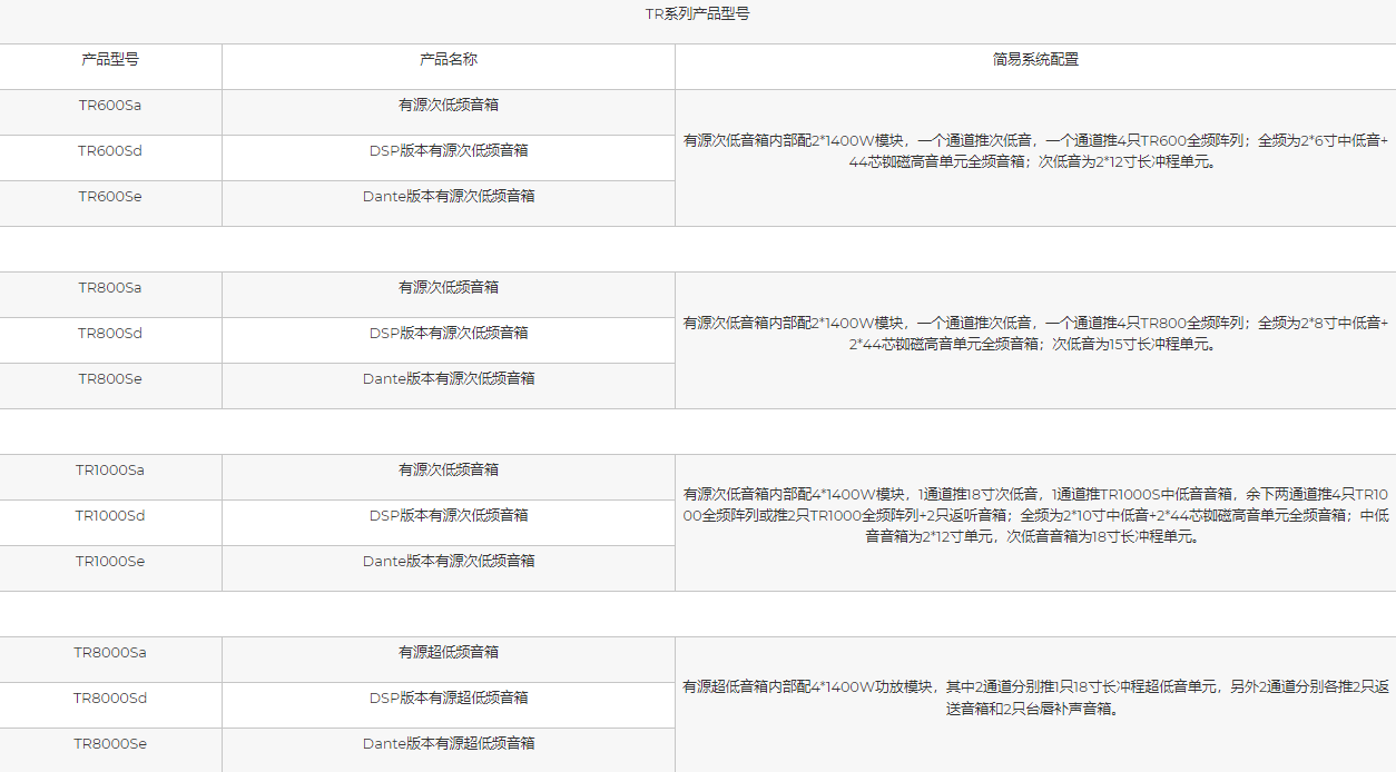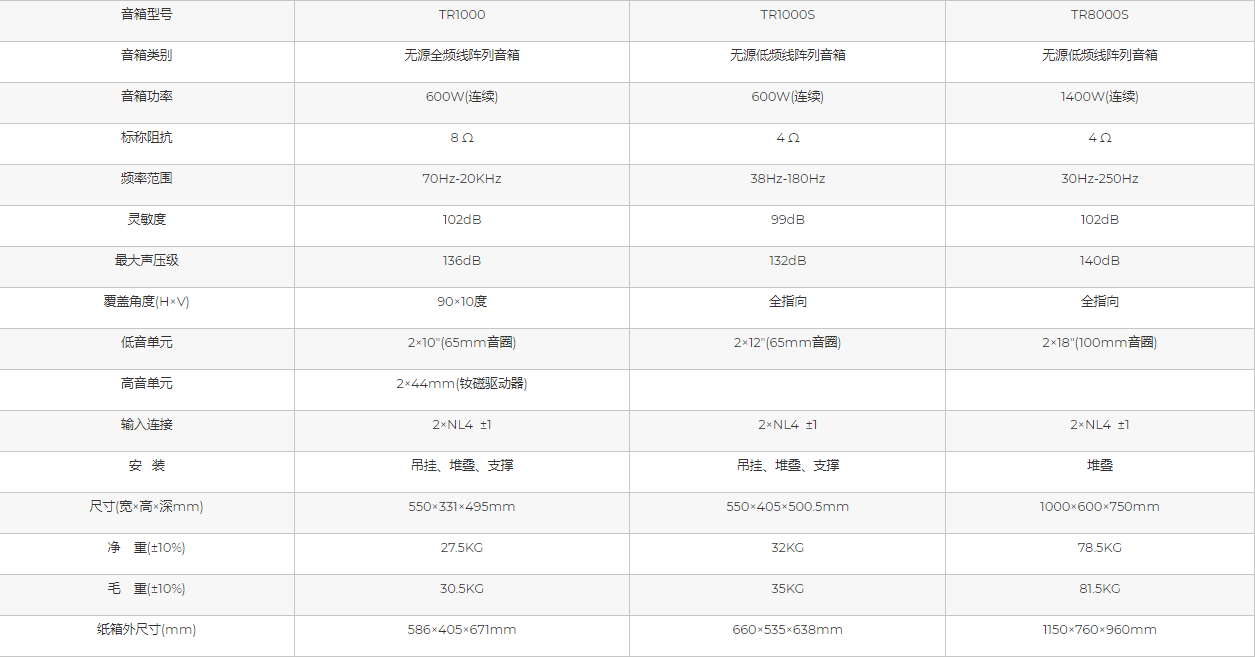 TR系列全称Transformer变形金刚有源线阵列音响,是一款运装一体的有源速装线阵列音响系统,配备多通道网络传输及WiFi无线控制,同时还内置进口ADI公司的高速DSP处理器,及模块化设计功放模组。是惠威新开发一款紧凑型有源线阵列音箱系统,采用特制的三点吊挂系统结构和低频音箱带滑轮功能,可方便快捷组合安装、移动、运输。无源全频音箱采用内置分频线路,搭配三款可选配的有源低频音箱系统组成系统,可吊挂、堆叠、支撑多种安装模式,形成良好的垂直覆盖面指向性,连续声压级高,动态大,瞬态好。搭配内置专业电声技术优化的分频网络,垂直天花面及地面的声反射小,声音重放清晰,动态强大。