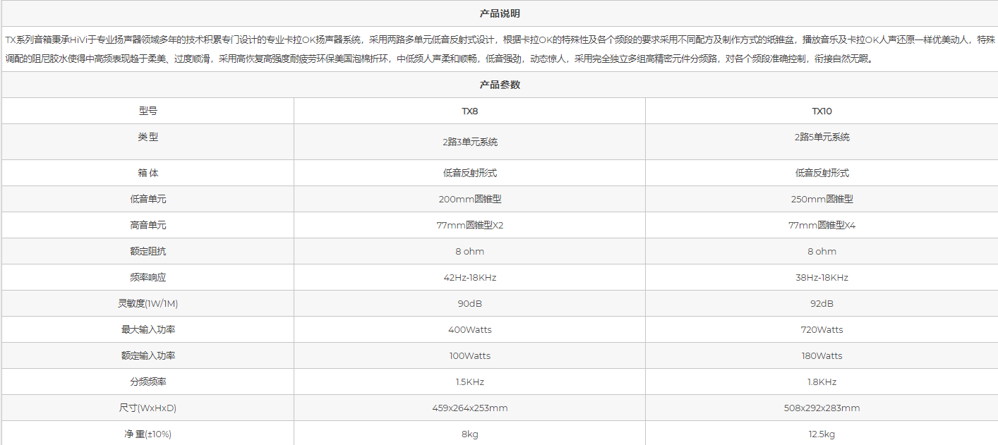 TX系列音箱秉承HiVi于专业扬声器领域多年的技术积累专门设计的专业卡拉OK扬声器系统,采用两路多单元低音反射式设计,根据卡拉OK的特殊性及各个频段的要求采用不同配方及制作方式的纸锥盆,播放音乐及卡拉OK人声还原一样优美动人,特殊调配的阻尼胶水使得中高频表现趋于柔美、过度顺滑,采用高恢复高强度耐疲劳环保美国泡棉折环,中低频人声柔和顺畅,低音强劲,动态惊人,采用完全独立多组高精密元件分频路,对各个频段准确控制,衔接自然无暇。