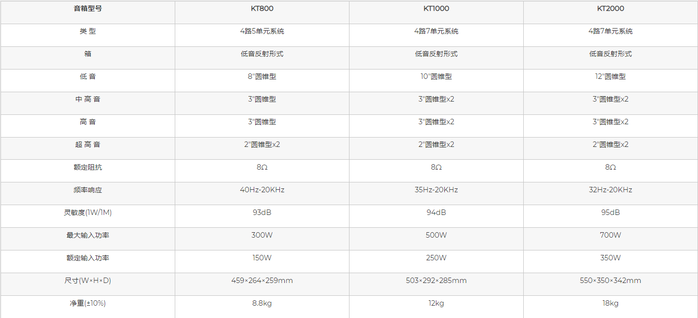 ①KT系列卡拉OK音箱包含三个产品型号,KT800/KT1000/KT2000,其中KT800为4路五单元系统,KT1000/KT2000为4路七单元系统,根据卡拉OK的特殊性及各个频段的要求,纸锥盆采用不同的制作方式,特殊调配的阻尼胶水使中高频表现柔美且过渡顺滑,采用高恢复高强度耐疲劳美国环保泡棉折环,中高频柔和顺畅,低音强劲,动态凌厉。