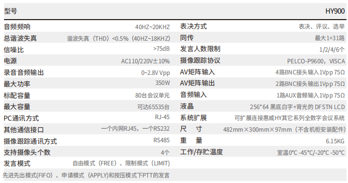 HY900CV:在HY900CF全功能主席基础上取消同传功能,外观与其余功能一致。