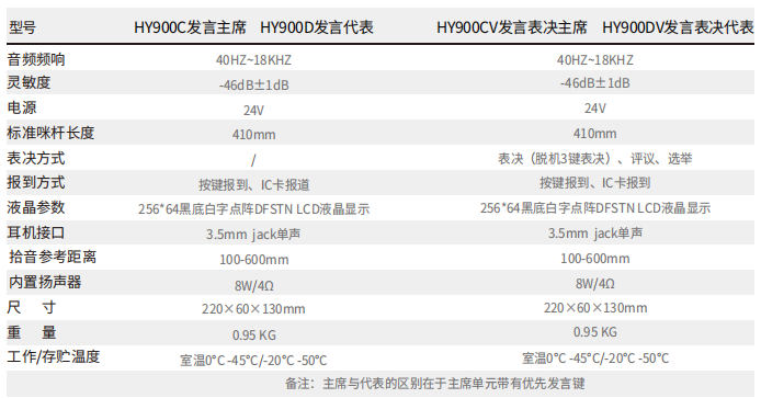 HY900D 基本讨论代表 / HY900DF 全功能代表 / HY900DV 讨论表决代表 / HY900DI 讨论同传代表