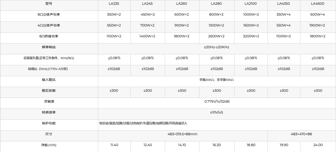 LA系列功放是惠威专为各种室内外场所研发设计的扩音系统产品,借鉴当今国际技术和工艺精心研制,是少有的高性能、高稳定性、高可靠性的上佳产品,其声音清晰、透明,音质同Hi-Fi产品媲美,功率输出足、频响更宽广、声音更有穿透力、更有层次感。