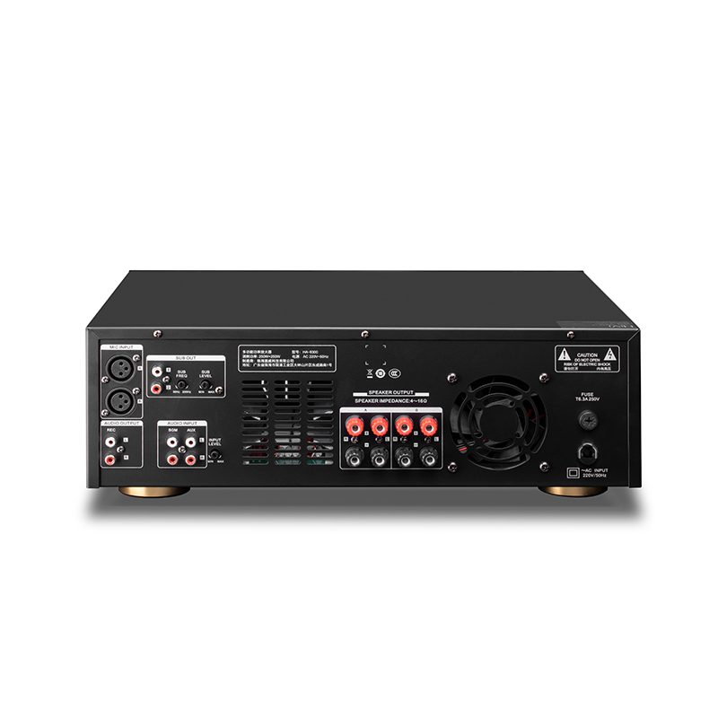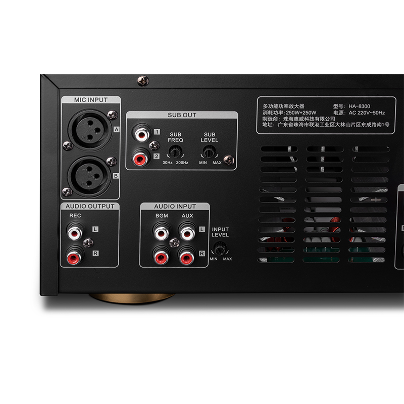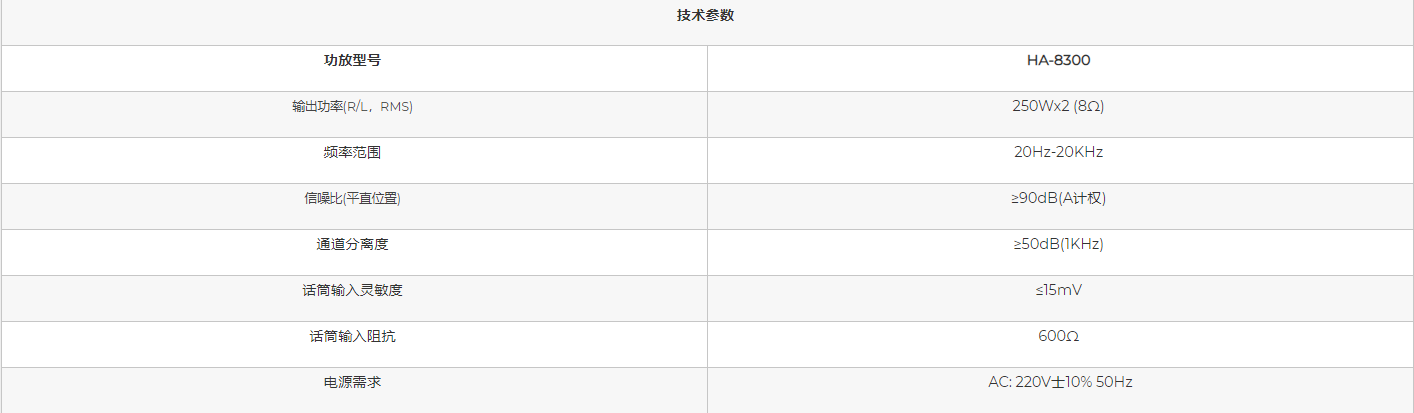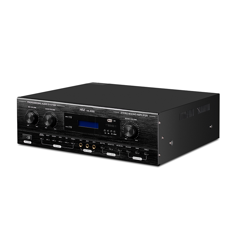 HA-8300合并式功放特别适合于专业娱乐场所和家庭娱乐卡拉0K使用,采用上佳数字混响芯片,具有卡拉0K演唱效果。可独立调节话筒、音乐、合成信号的音量、音调及相关功能,是专业人士优选产品。