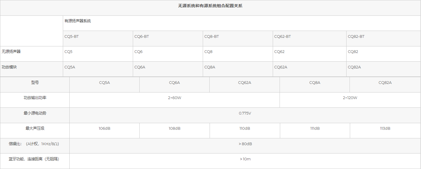 CQ系列平整的频率响应曲线,声音表现超然服俗,平衡性佳。全新的开孔模板设计,安装简单准确。全新的喷漆模板设计,可以程据需要使它们的外观与使用环境完全一致。内置蓝牙模块,连接快捷稳定,声音自然清晰。
