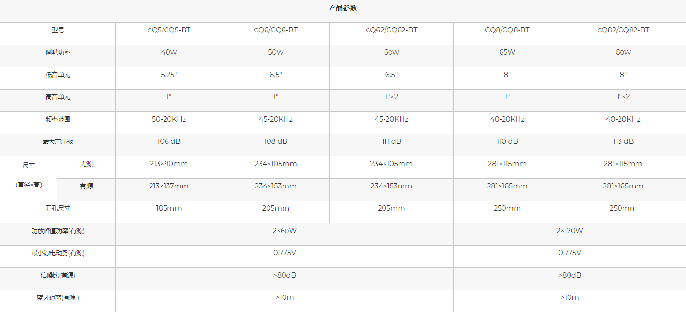 3. CQ系列采用高强度云母碳化聚丙烯振膜,高损耗耐疲劳橡胶折环;防水防潮、美观大方且提供超乎想象的语言清晰表现。